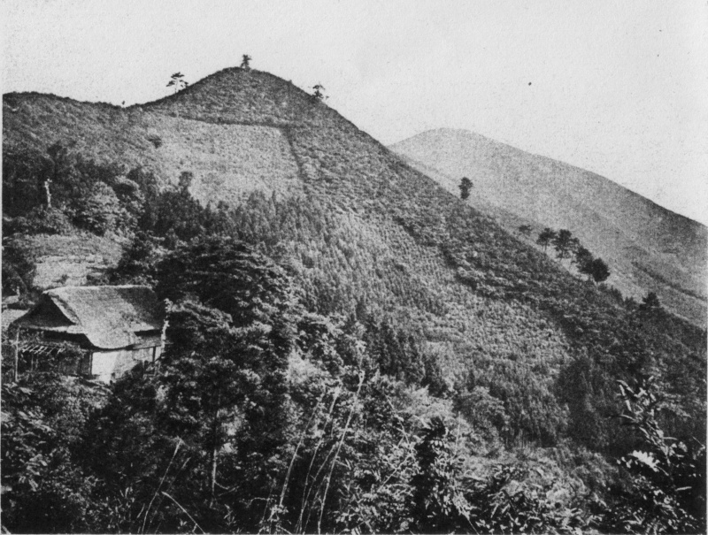 小仏峠の旧観。右遠景は景信山、中央のピークはヤゴ沢の頭。明治43年(1910年)6月、辻本満丸撮影(出典:高畑棟材著『山を行く』3)