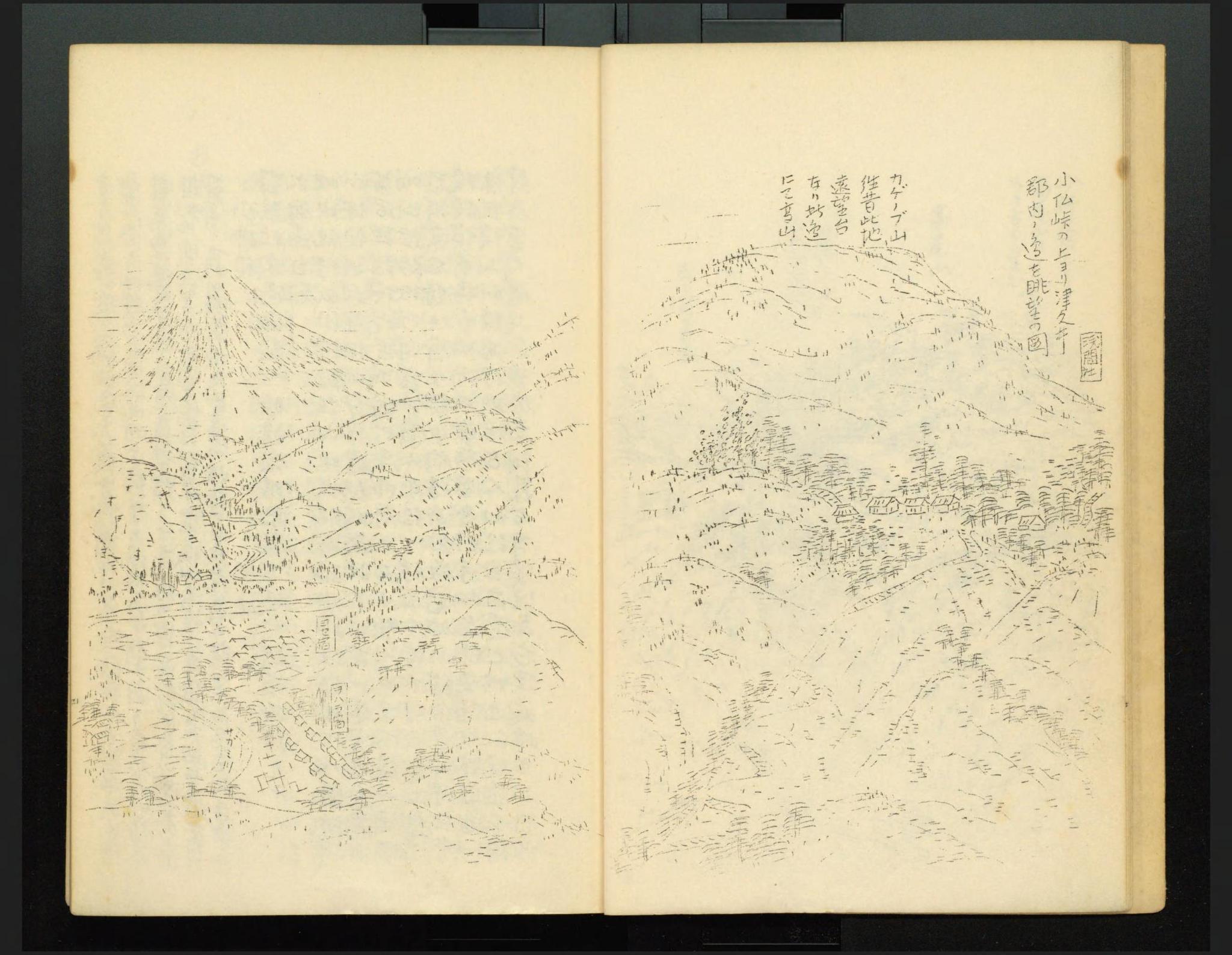 小仏峠の上ヨリ津久井郡内ノ道を眺望の図(出典:『武蔵名勝図会』 国立国会図書館デジタルコレクション6 )。小仏峠に5軒(うち4軒は現在の「広場」に相当するところに立地している形で)描かれている。図の左下には小原宿・与瀬宿および相模川(現在の相模湖附近)が、左上にはデフォルメされた富士山が描かれている。