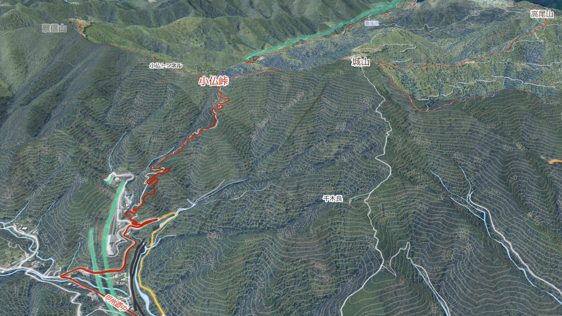 小仏峠の鳥瞰図。手前側が神奈川県相模原市、奥側が東京都八王子市。景信山(標高727.3m)と城山(小仏城山)(標高670.4m)の間の鞍部が小仏峠であり、都県境の尾根道(奥高尾縦走路)と甲州道中が交差している場所にあたる。(出典:地理院地図タイル(シームレス空中写真)、地理院地図Vector、MapTiler Outdoor schema (© MapTiler © OpenStreetMap contributors )、 産業技術総合研究所 シームレス標高タイル(陸域統合DEM) を maplibre で加工して作成。)